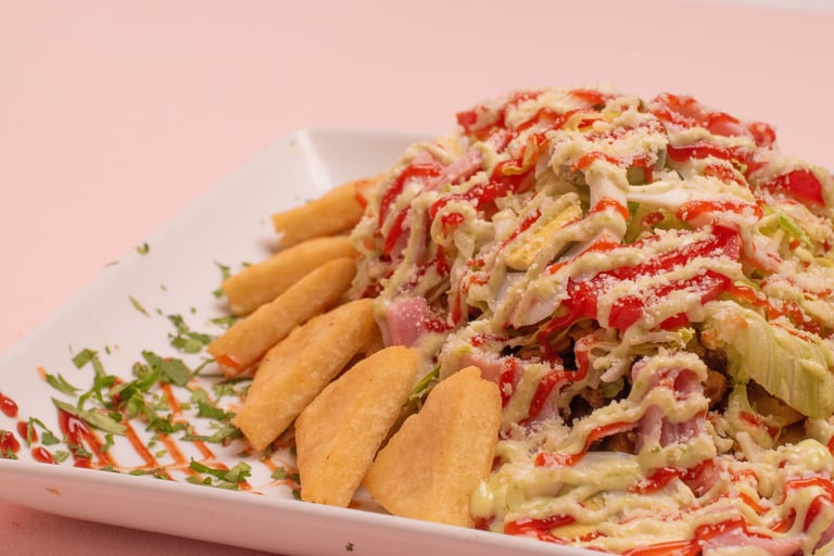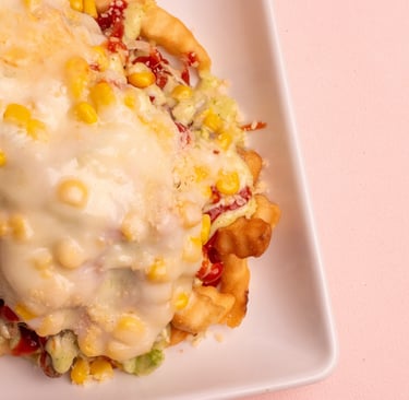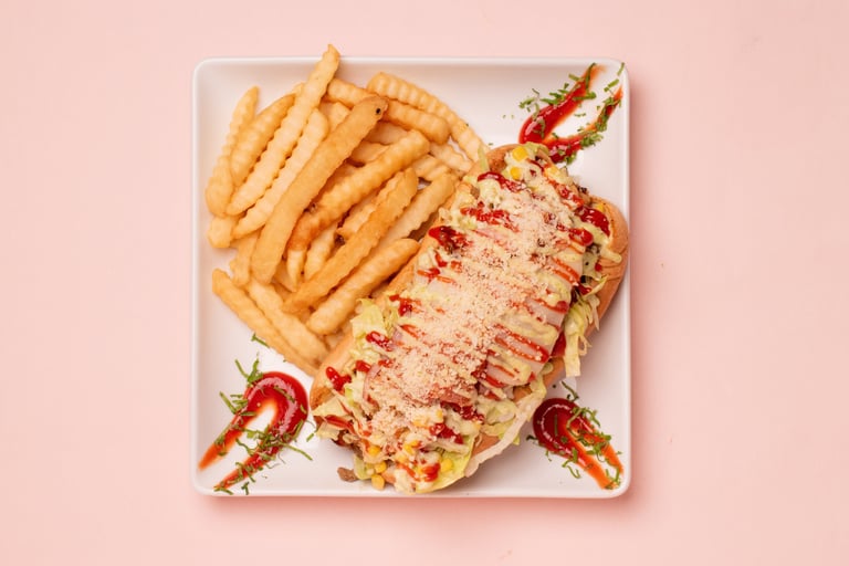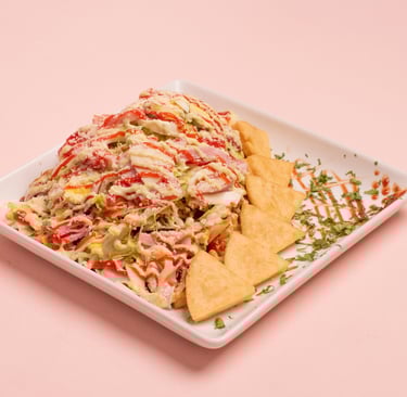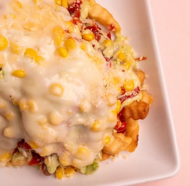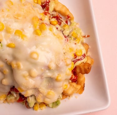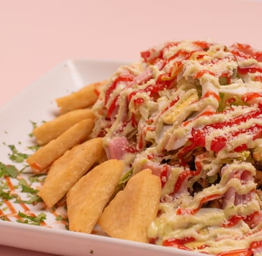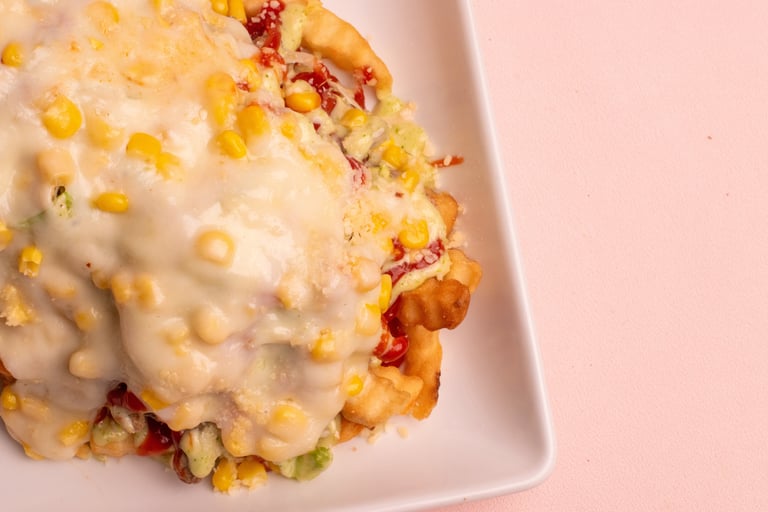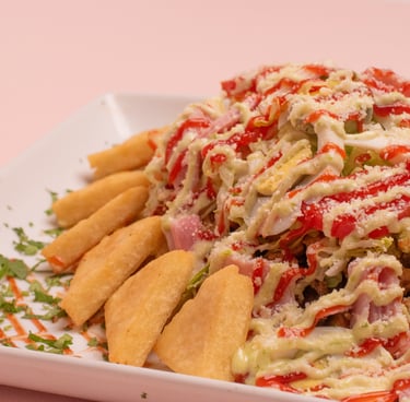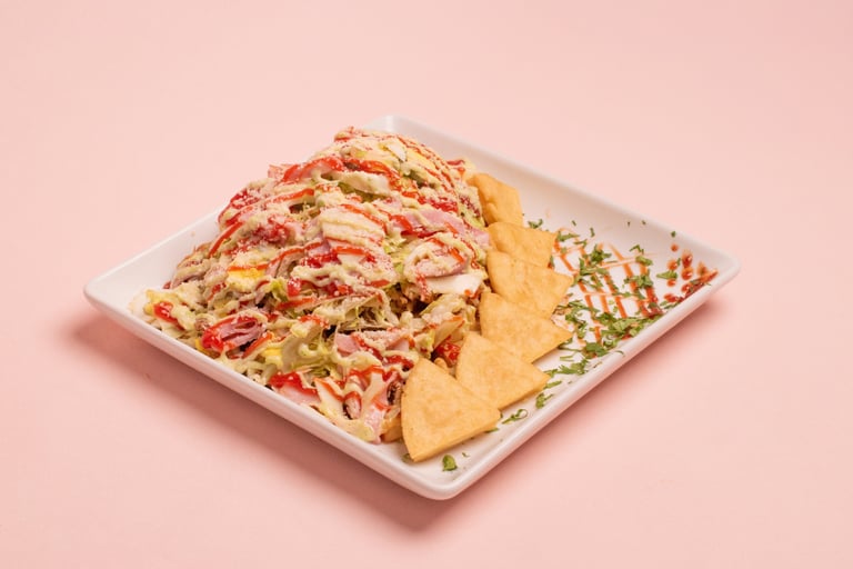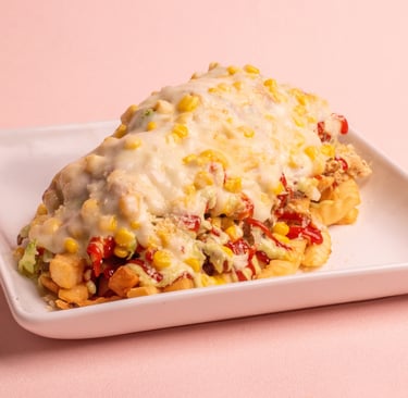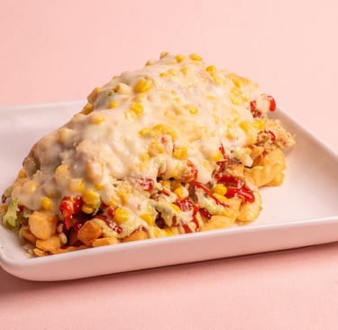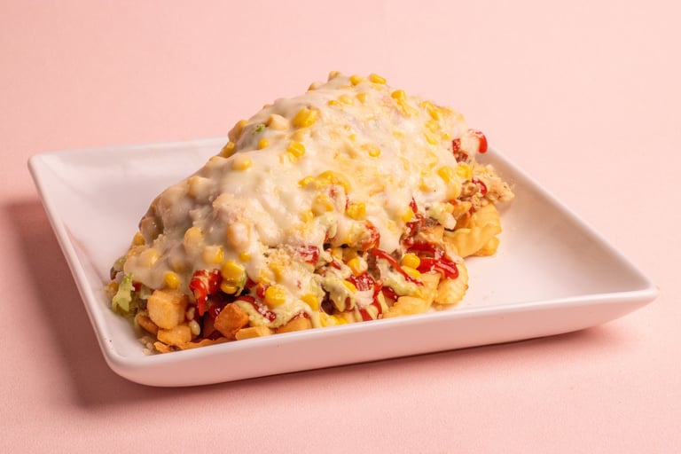 Fries, sausage, sliced beef, chicken fillet, lettuce, gratin cheese with corn and parmesan cheese with tartar and ketchup.