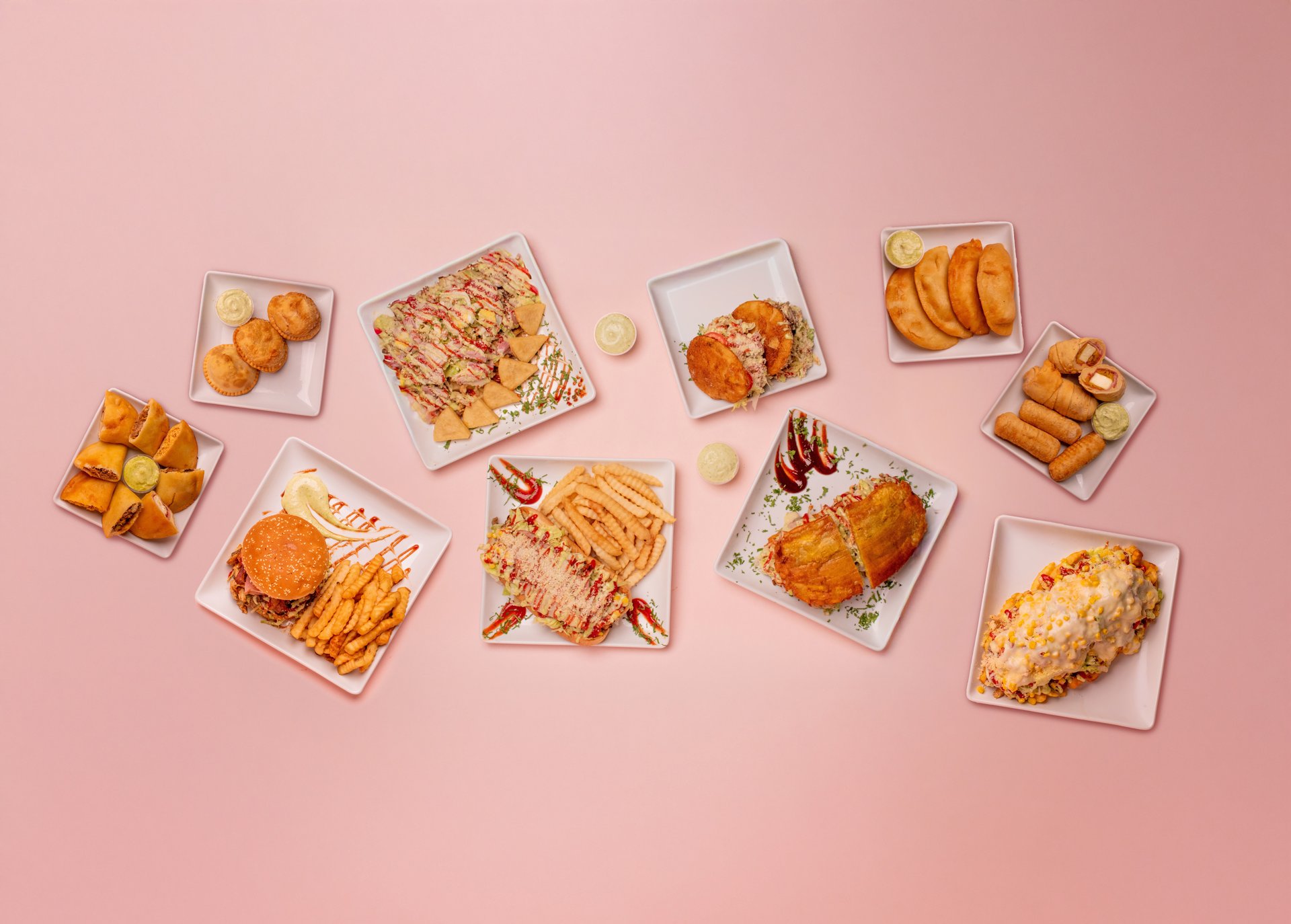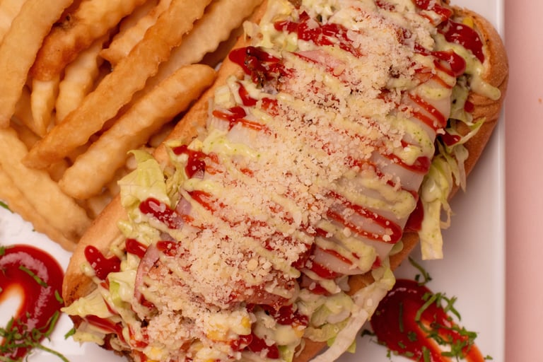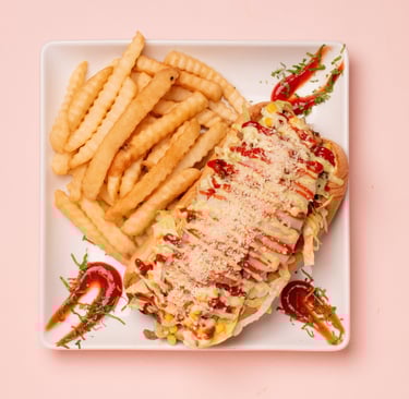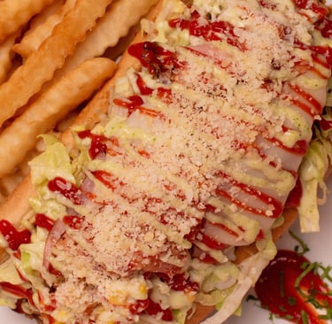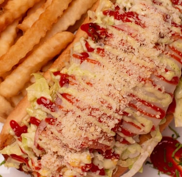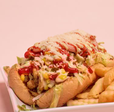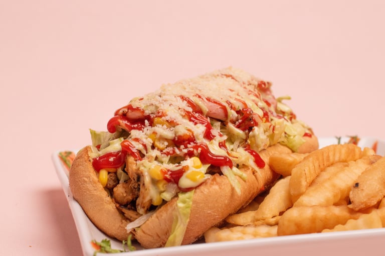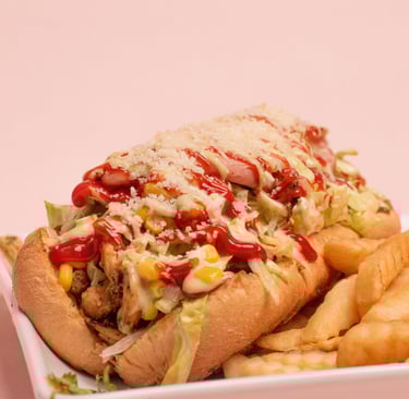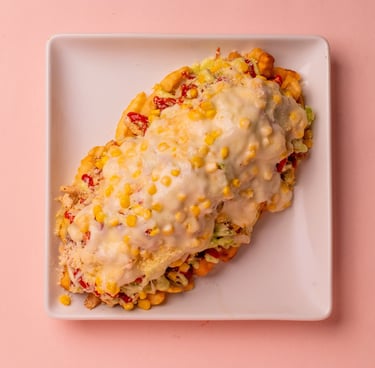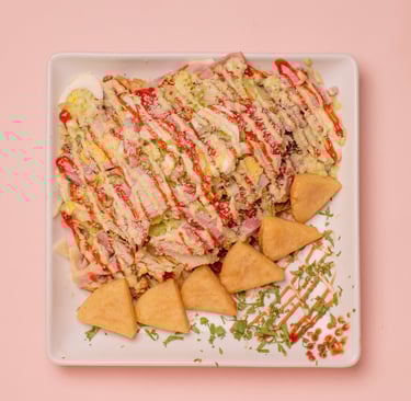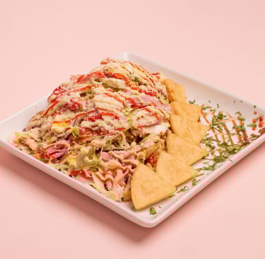 Fries, sausage, sliced beef, chicken fillet, lettuce, gratin cheese with corn and parmesan cheese with tartar and ketchup.