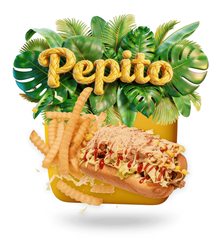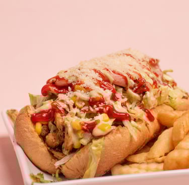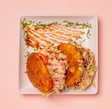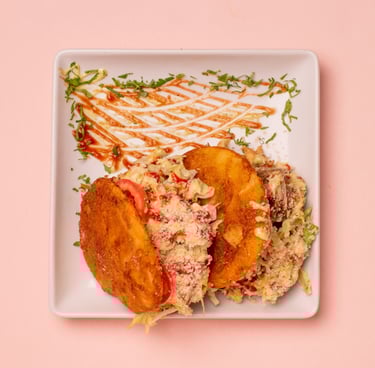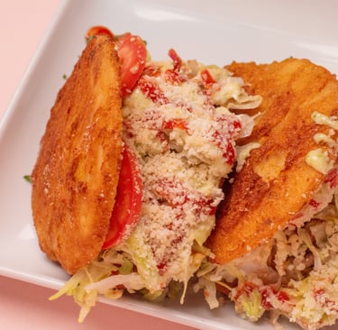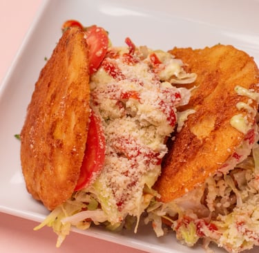 2 arepas, 1 type of meat. Battered arepa, bologna, beef, chicken, lettuce, tomato, Parmesan cheese. Tartar sauce and ketchup.