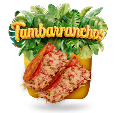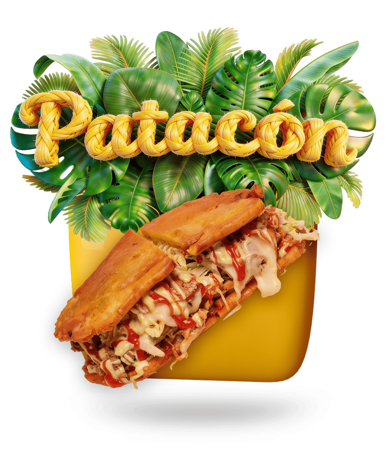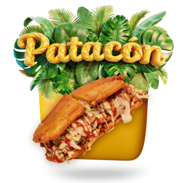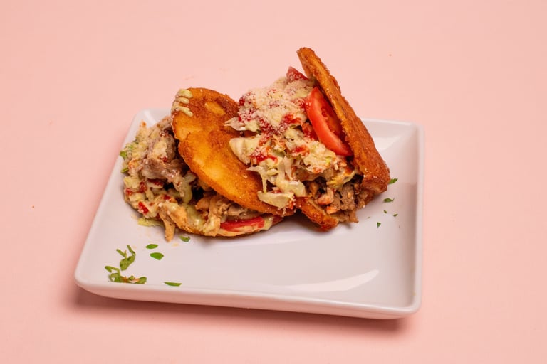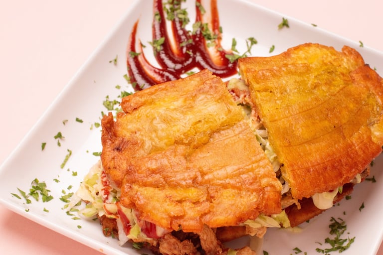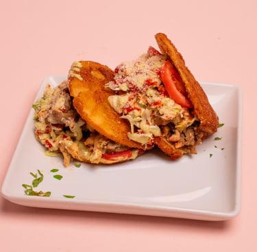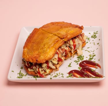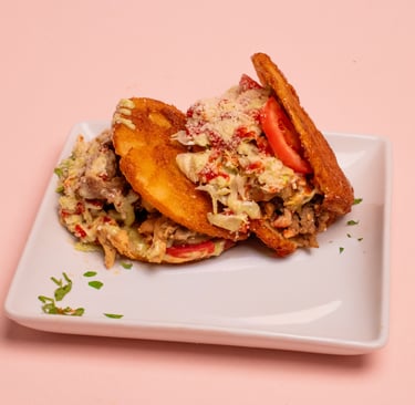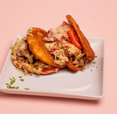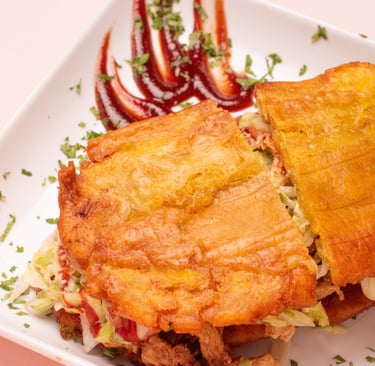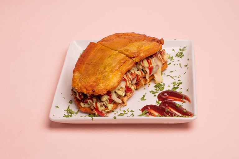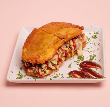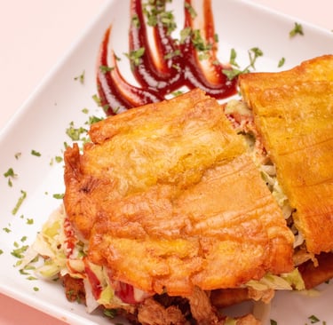 Two fried green or sweet plantain discs filled with proteins, lettuce, tomato, cheese, and various sauces.