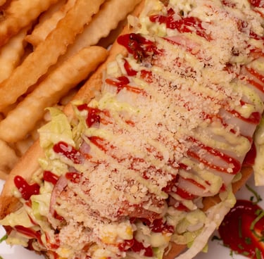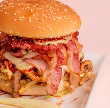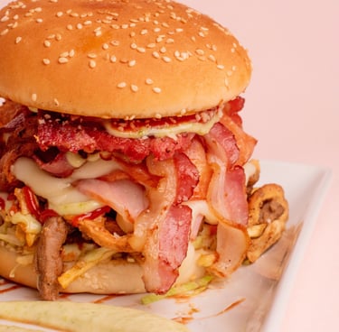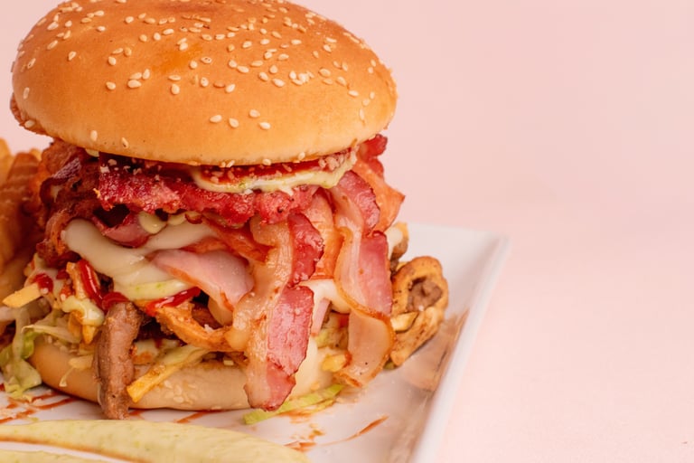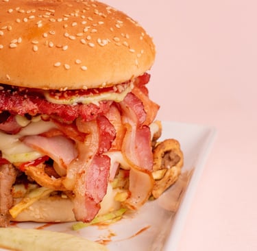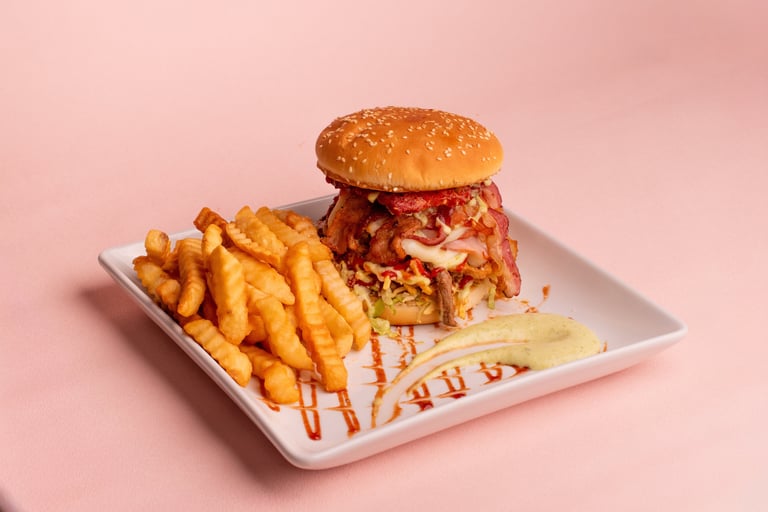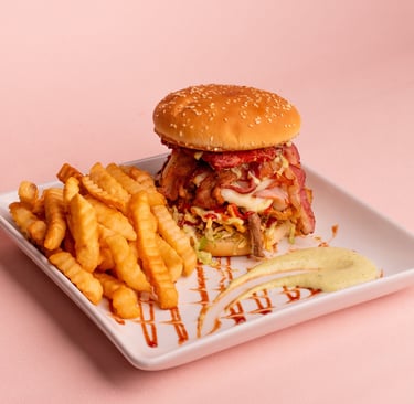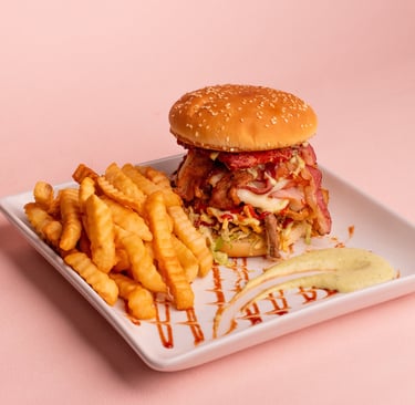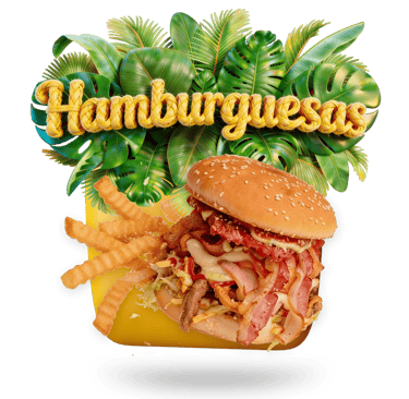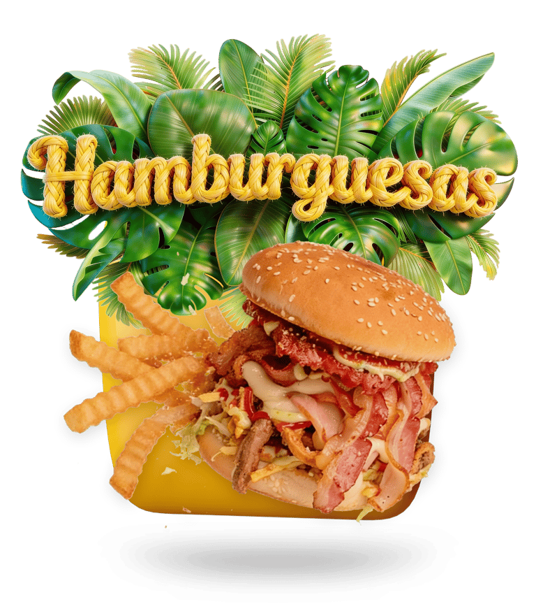 Venezuelan Burger with single, double, or triple meat option, tomato, lettuce, ham, cheese, tartar sauce, ketchup + fries