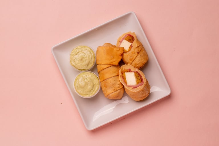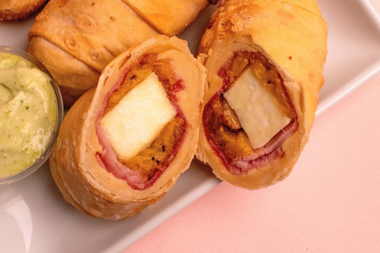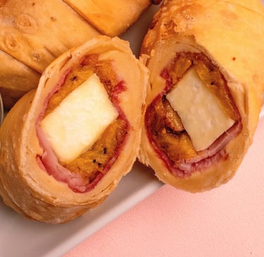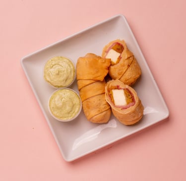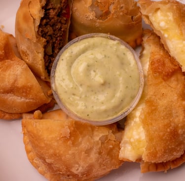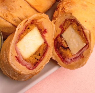 Fried, savory pastry turnover filled with cheese, ham, and sweet fried platain