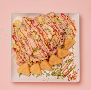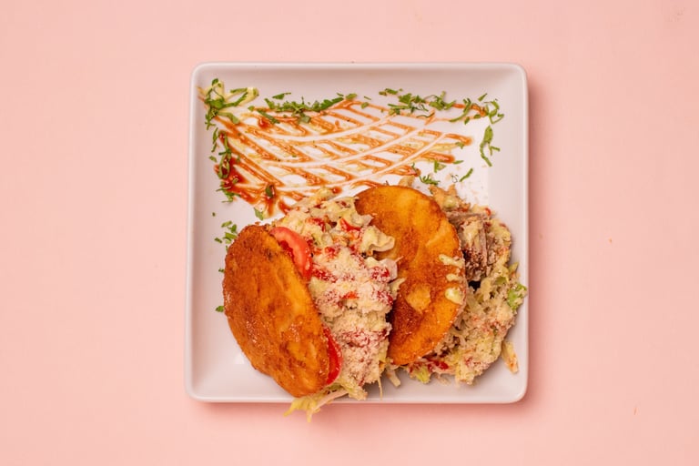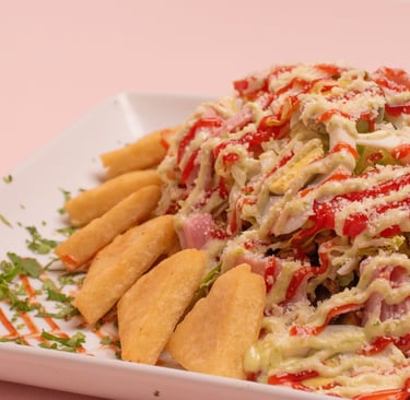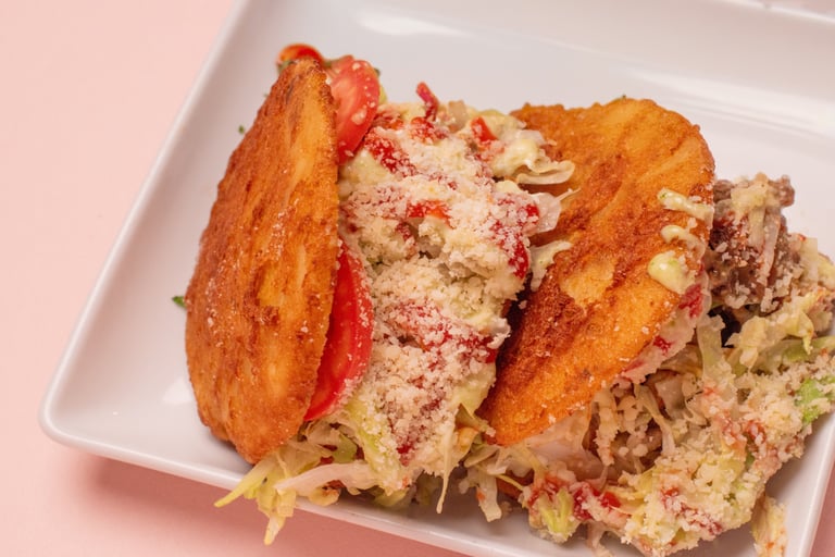 Fried triangle cut arepas, that is topped with beef, chicken, ham, cheese, lettuce tomato, parmesan, and boiled egg